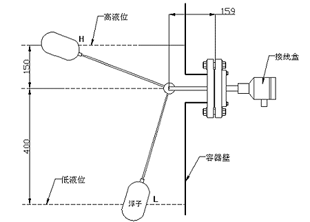 参见上图,当液位高于水平安装轴线以上150mm 时,即浮子到达H点时,本仪表输出导通信号,并一直保持导通状态,直到液位低于水平安装轴线以下400mm时,即浮子下降到L点时,本仪表才改变输出状态,输出断路信号,并保持断路状态,直到液位重新上升到水平安装轴线以上150mm 时,即浮子到达H点时,本仪表才再一次输出导通信号,并一直保持导通状态,直到液位重新低于水平安装轴线以下400mm时,即浮子下降到L点时,本仪表才又一次改变输出状态,输出断路信号。